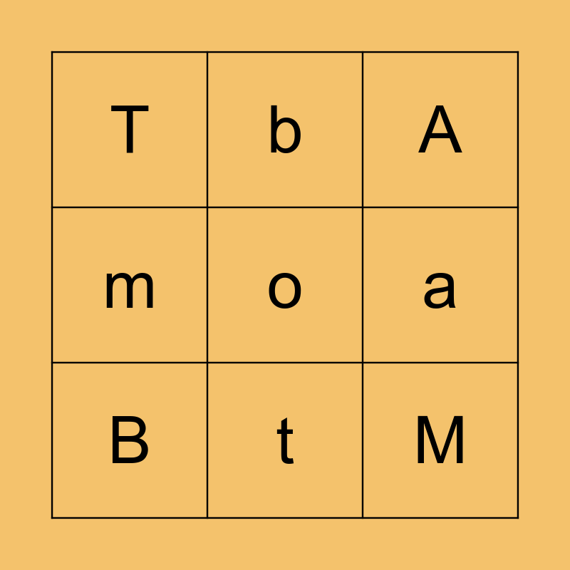 This bingo card has a free space and 8 words: a, A, b, B, T, M, m and t.