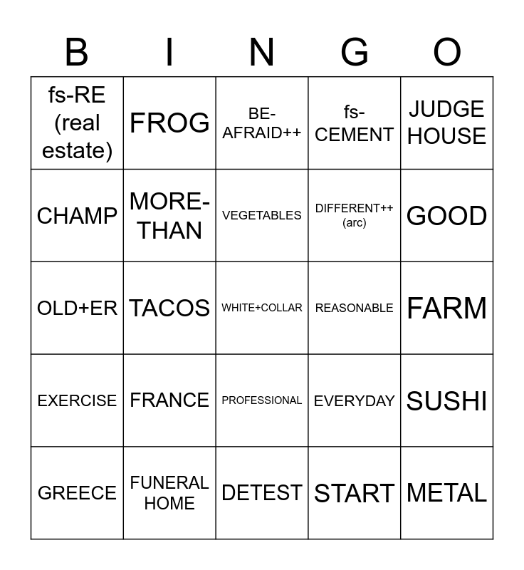 This bingo card has 173 words: DOWNTOWN, BUSINESS, MACHINE, HOME, FARM, COUNTRY, fs-HILLS, DCL “rolling hills”, ACROSS-FROM, THUMB-loc “back”, NEXT-TO-right, NEXT-TO-left, YOUNG FAMILY, OLD+ER, ART+ER, WHITE+COLLAR, BLUE+COLLAR, PROFESSIONAL, RETIRED, BLACK OR AFRICA+AMERICA, SPANISH OR MEXICO, WHITE+FACE, INDIA, ASIA, CHEERFUL/ HAPPY, COLD, MAD-char, NOSEY, NEAR, FREEWAY, SWIM fs-POOL, ART fs-STUDIO, HORSE fs-TRAIL, FARM ++fs-MARKET, fs-FERRY/ BOAT, QUIET, NOISY, fs-SAFE, DANGEROUS, “area” TRAFFIC, (2h) ECL “empty streets”, TRAFFIC, CLEAN, DIRTY, SMELL STINKY, BORING, MANY (2h) #DO-circle, EXPENSIVE, CHEAP, UP-TILL-NOW, LONG-AGO, CHANGE++(arc), PRETTY, DIFFERENT++(arc), DIVERSE, MOST, SOME, FEW/SEVERAL, HOTEL, STARBUCKS, MCDONALD'S, EXERCISE, fs-RE (real estate), FURNITURE, CAR INSURANCE, fs-DEPT STORE, SMALL STORE OPEN ALL-NIGHT, SANDWICH STORE, FOOD STORE, PHONE STORE, FUNERAL HOME, DOLLAR STORE, CITY fs-HALL, JUDGE HOUSE, POLICE, PARKING, FIREFIGHTER, START, FINISH, GET-UP, GET-IN-BED, (whq) TIME, LEAVE-FROM, ARRIVE-TO, fs-FIX, IRON, TOUCH, DOWNLOAD, SPIDER, BUGS, FROG, INTERNET, PARIS, KNOW fs-HOW, MORE-THAN, EVERYDAY, BE-AFRAID++, EARLY, fs-EARLY, CHINA, ITALY, JAPAN, FRANCE, THAI, GREECE, MEXICO, AMERICA, VEGETARIAN/ VEGAN/ VEGETABLE, INDIA, #PIZZA, SANDWICH, HAMBURGER, PASTA, SALAD, #BBQ, fs-FF, (french fries), fs-FAJ, (fajitas), FISH, SHRIMP, CHICKEN, STEAK/MEAT, fs-RICE, SUSHI, DESSERT, WATER, JUICE (apple or orange), ICE-CREAM, SODA-POP, TEA, COFFEE, CHEESE, HOT-DOG, COOKIE, PANCAKES, TACOS, POPCORN, MASHED POTATOES, EGGS, BACON, VEGETABLES, FRUITS, BREAD, BUTTER, EXPENSIVE, SO-SO EXPENSIVE, REASONABLE, CHEAP, FREE, DELICIOUS, CHAMP, GOOD, INTERESTING, LOUSY, DETEST, YUCK/ AWFUL, WOOD, GLASS, METAL, STUCCO, fs-CEMENT, ROCK/ STONE, RED+BRICK, FACE SAME-AS, WHAT-KIND, VARIOUS-THINGS, HOME+MAKE, INTERSECTION, CROSS-STREET/ CORNER, GO-PAST, LIGHT, LEFT and RIGHT.