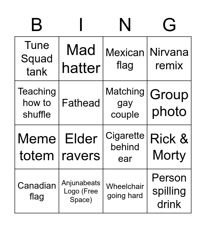 This bingo card has 31 words: Pasties + Thong, Couple Arguing, Rick & Morty, Train of people holding hands, Tune Squad tank, Mexican flag, Matching gay couple, A furry (ears + tail), Anjunabeats Logo (Free Space), Unicorn onesie, Wheelchair going hard, Canadian flag, Glover rolling, Undercover, Elder ravers, Sunglasses after dark, D.A.R.E. item, Person needs a lighter, Person spilling drink, Person actively doing drugs, Teaching how to shuffle, Rezz goggles, Anjuna tattoo, Mad hatter, Meme totem, Fathead, Nirvana remix, Cigarette behind ear, First time rolling/raving, Group photo and Free hugs sign.