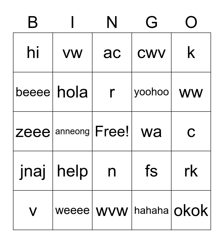 This bingo card has a free space and 24 words: help, weeee, r, v, k, hi, beeee, vw, wa, n, yoohoo, zeee, fs, rk, hola, hahaha, c, ac, ww, anneong, okok, jnaj, cwv and wvw.