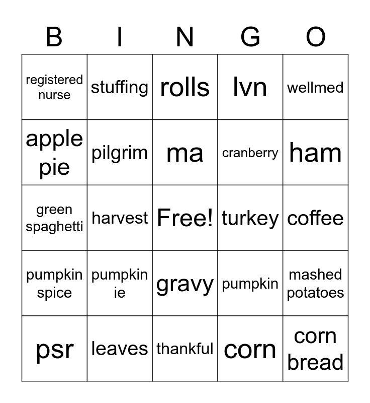 This bingo card has a free space and 24 words: pumpkin ie, leaves, ma, psr, wellmed, registered nurse, apple pie, stuffing, turkey, gravy, cranberry, green spaghetti, pumpkin, mashed potatoes, pilgrim, corn, coffee, rolls, ham, harvest, corn bread, pumpkin spice, lvn and thankful.