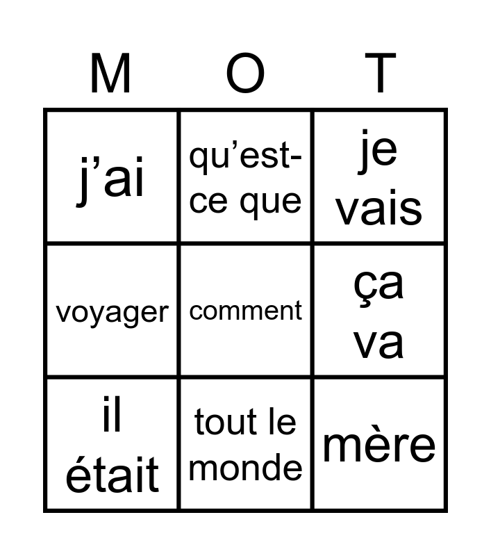 This bingo card has 40 words: bonjour, écouter, je peux, il était, je suis, ceci, tout le monde, c’est, comment, programme, où, voyager, pourquoi, aller, maison, nous pouvons, beaucoup, j’ai, voiture, je vais, école, est-ce-que, mère, ça va, Je vois, je suis allé (e), parce que, j’ai fini, professeur, Il y a, ville, après, nous, quand, faire, qui, être, aujourd’hui, qu’est-ce que and famille.