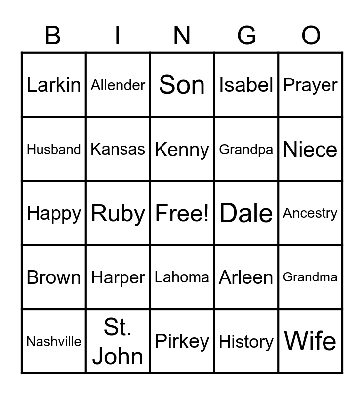 This bingo card has a free space and 74 words: Malinda, Germany, Kenny, Treasure, Lloyd, Quilters, Lawrence, Sister, Leona, Nephew, Nashville, Lechner, Grandpa, Prayer, Lindy, St. John, Kahmeyer, Dale, Dwayne, Larkin, Ruby, Son, Isabel, Ancestry, Husband, Verna, Cherish, Klusman, Indiana, Imogene, Kansas, John, Food, Linda Sue, Daughter, Wiske, Nutty Clusters, Eunice, Wife, Memories, Bud, Lahoma, Cousin, Reunion, Dirks, Allender, Medicine Lodge, Lutheran, Frances, History, Harriette, Family, Arleen, Aunt, June, Brother, Pirkey, Ernest F., Love, Brown, Harper, Winter, History, Grandma, Happy, Hellman, Uncle, Trinity, Niece, Roland, Laughter, Generations, Doris and Time.