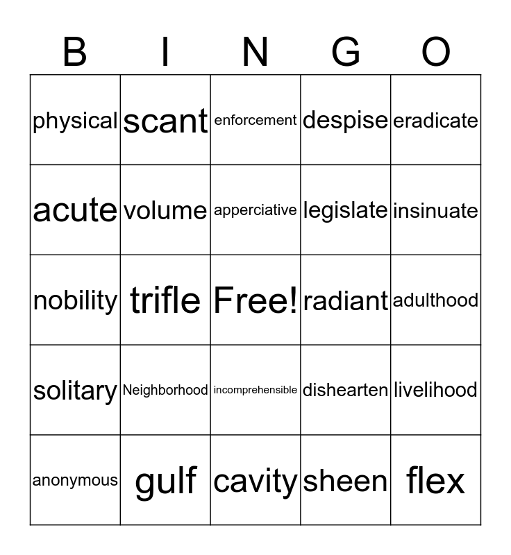 This bingo card has a free space and 24 words: Neighborhood, gulf, apperciative, anonymous, eradicate, physical, acute, scant, radiant, incomprehensible, legislate, nobility, dishearten, livelihood, volume, sheen, adulthood, enforcement, insinuate, trifle, flex, solitary, despise and cavity.