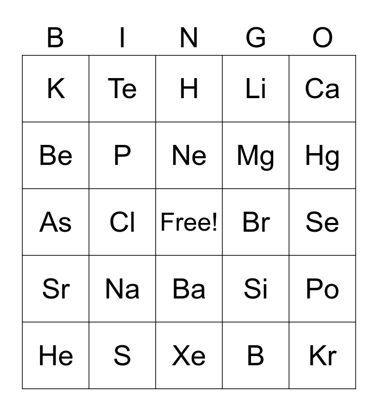 This bingo card has a free space and 29 words: He, F, Cl, Fr, K, H, P, Na, Br, S, Se, Kr, Xe, B, Hg, Sn, Ba, Sr, Ca, As, Si, At, Mg, Be, Li, Te, Po, Ne and Rn.