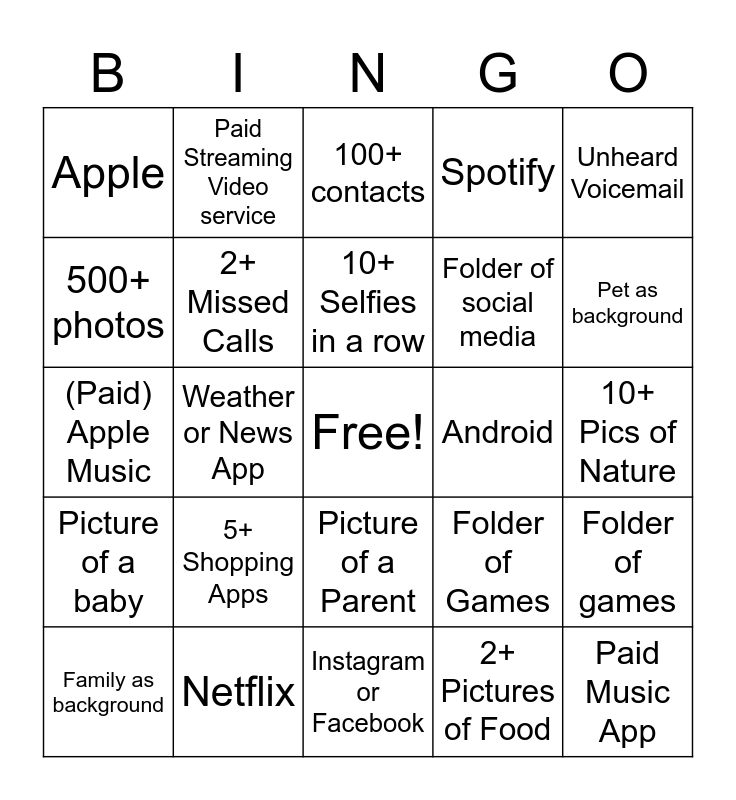 This bingo card has a free space and 31 words: Instagram or Facebook, More than 3 Alarms set, Weather or News App, Screenshot of Something you thought you would forget, Apple, 100+ contacts, 2+ Missed Calls, Folder of Games, Android, 2+ Pictures of Food, 10+ Pics of Nature, Paid Music App, Video of a child, Fitness or Health App, Pet as background, 2+ Food or Restaurant App, Folder of games, 5+ Shopping Apps, Picture of a baby, Picture of a Parent, Unheard Voicemail, 2+ group chats, Family as background, Paid Streaming Video service, Folder of social media, 500+ photos, Spotify, (Paid) Apple Music, Netflix, 10+ Selfies in a row and Hulu.
