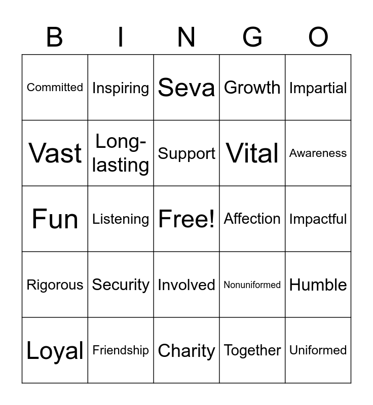 This bingo card has a free space and 99 words: Volunteer, Kindness, Compassion, Seva, Giving, Devotion, Helping, Passion, Selfless, Service, Friendly, Thoughtful, Caring, Involved, Community, Committed, Inspiring, Generous, Leaders, Work no words, Khidma, Time, Learning, Empathy, Reliable, Humble, Support, Family, Powerful, Team, Charity, Together, Love, Teamwork, Listening, Fun, Unity, Knowledge, Sacrifice, Security, Duty, Awareness, Growth, Friendship, Happiness, Success, Role model, Community service, Strong, Vibrant, Warmth, Uniformed, Nonuniformed, Badge, Gracious, Everlasting, Generations, Sparkling, Undefined, Connection, Brilliant, Safety, Diversity, Motto, Pure, Impartial, Equality, Endless, Constant, Rigorous, Beautiful, Vital, Vast, Compromise, Life, Immense, Long-lasting, Willful, Spirit, Effective, Affection, Enthusiasm, Value, Brave, Virtuous, Tradition, Responsibility, Quality, Impactful, Loyal, Courageous, Heart, Gratitude, Contribution, Hardworking, Empowering, Relentless, Essential and Respect.
