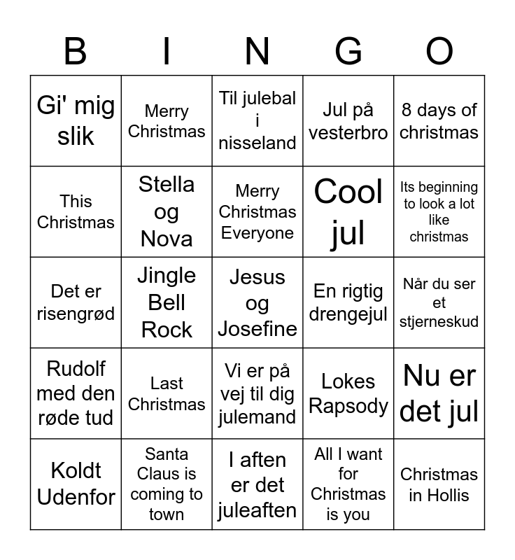 This bingo card has 53 words: Free!, Jesus og Josefine, Let love be love, All I want for Christmas is you, Last Christmas, My only wish (this year), Merry Christmas, Happy Holidays, This Christmas, Drømte mig en lille drøm, Stella og Nova, Pagten, Nu er det jul, Lokes Rapsody, I morgen og i dag, Koldt Udenfor, Merry Christmas Everyone, En rigtig drengejul, White christmas, 8 days of christmas, Jingle Bell Rock, Christmas in Hollis, Cool jul, Gi' mig slik, Mistletoe, Santa Claus is coming to town, Have yourself a merry little christmas, What christmas means to me, Happy Xmas (War is over), Its beginning to look a lot like christmas, Guld Jul, Jul i Angora, Søren banjomus, I en stjerneregn af sne, Jul i krummeland, På loftet sidder Nissen, Jul på vesterbro, I aften er det juleaften, Til julebal i nisseland, Endelig jul igen, Når det er juletid, Alletiders jul, Når du ser et stjerneskud, Driving Home for christmas, Jingle bells, Vi er på vej til dig julemand, Den himmelblå, Højt for træets grønne top, Det er risengrød, Rudolf med den røde tud, Jeg så julemanden kysse mor, God jul (kometernes jul) and Hey mor and Tinka.