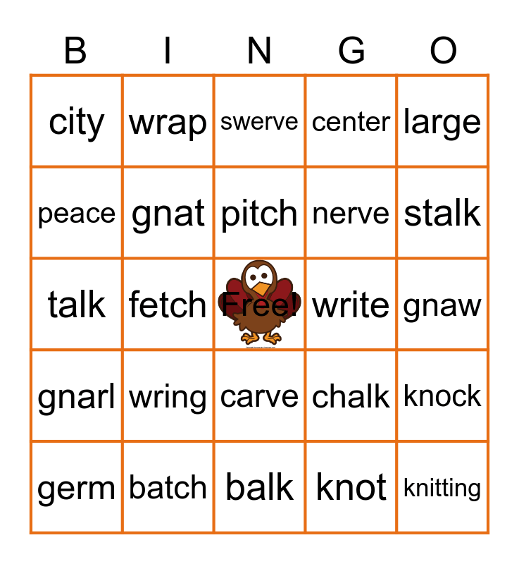 This bingo card has a free space and 24 words: wring, batch, pitch, germ, large, city, peace, wrap, write, carve, nerve, talk, chalk, knock, gnat, knot, gnaw, swerve, stalk, fetch, knitting, gnarl, center and balk.