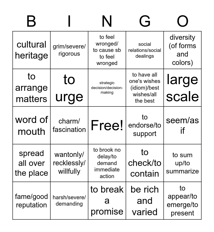 This bingo card has a free space and 24 words: wantonly/ recklessly/ willfully, harsh/severe/ demanding, strategic decision/decision-making, fame/good reputation, diversity (of forms and colors), cultural heritage, to arrange matters, grim/severe/ rigorous, to endorse/to support, to brook no delay/to demand immediate action, to have all one's wishes (idiom)/best wishes/all the best, word of mouth, to check/to contain, to sum up/to summarize, to urge, be rich and varied, seem/as if, to feel wronged/ to cause sb to feel wronged, large scale, charm/ fascination, to appear/to emerge/to present, spread all over the place, social relations/social dealings and to break a promise.