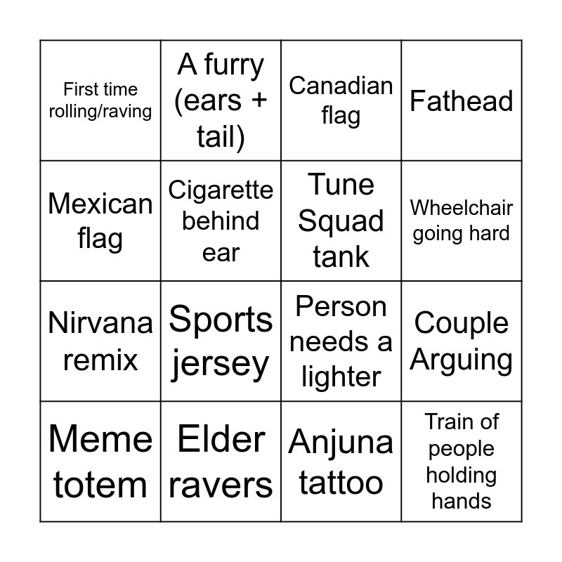 This bingo card has 32 words: Free!, Pasties + Thong, Couple Arguing, Rick & Morty, Train of people holding hands, Tune Squad tank, Mexican flag, Matching gay couple, A furry (ears + tail), Unicorn onesie, Wheelchair going hard, Canadian flag, Glover rolling, Undercover, Elder ravers, Sunglasses after dark, D.A.R.E. item, Person needs a lighter, Person spilling drink, Person actively doing drugs, Teaching how to shuffle, Rezz goggles, Anjuna tattoo, Mad hatter, Meme totem, Fathead, Nirvana remix, Cigarette behind ear, First time rolling/raving, Group photo, Free hugs sign and Sports jersey.