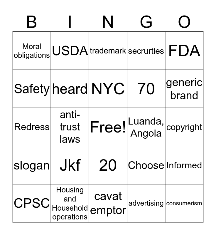 This bingo card has a free space and 24 words: Jkf, Housing and Household operations, NYC, CPSC, FDA, Moral obligations, Safety, USDA, Luanda, Angola, 20, 70, Redress, Choose, Informed, heard, advertising, copyright, trademark, generic brand, anti-trust laws, consumerism, slogan, secrurties and cavat emptor.
