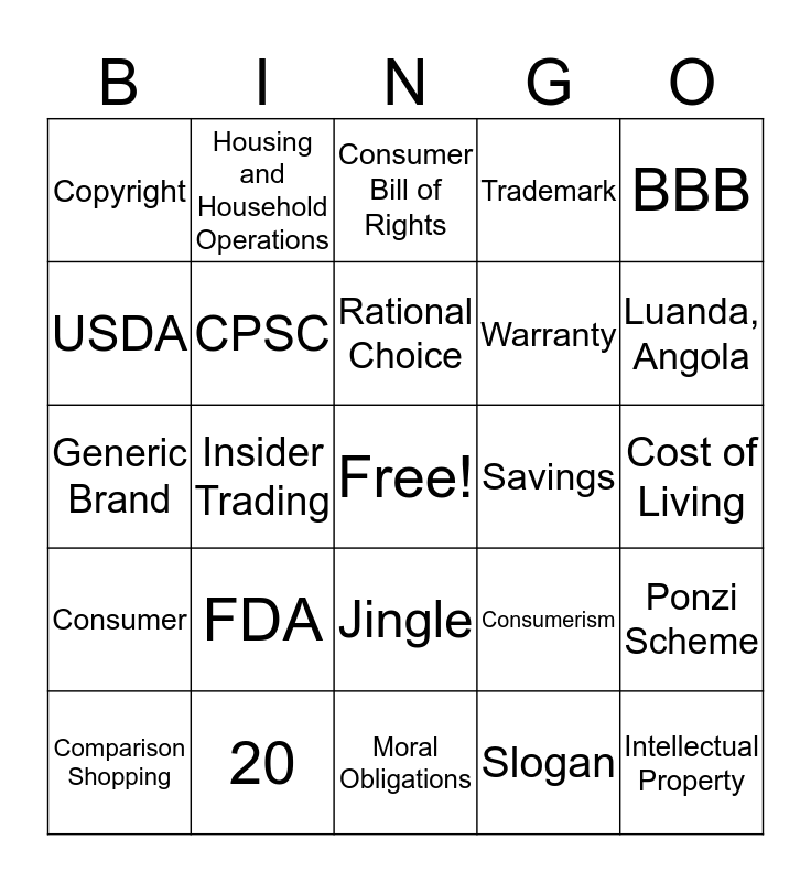 This bingo card has a free space and 24 words: FDA, 20, Rational Choice, Comparison Shopping, BBB, Copyright, USDA, Housing and Household Operations, Savings, Jingle, Warranty, Generic Brand, Consumerism, Ponzi Scheme, CPSC, Slogan, Cost of Living, Consumer Bill of Rights, Luanda, Angola, Insider Trading, Intellectual Property, Consumer, Trademark and Moral Obligations.