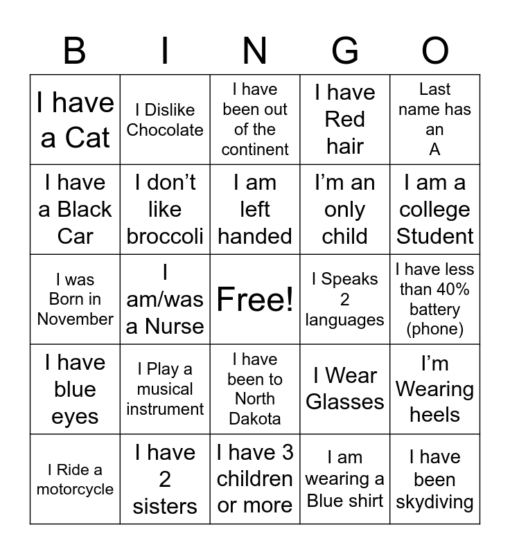 This bingo card has a free space and 24 words: I Play a musical instrument, I have 2 sisters, I am left handed, I Ride a motorcycle, Last name has an A, I have a Cat, I have a Black Car, I Dislike Chocolate, I Speaks 2 languages, I have been to North Dakota, I’m an only child, I was Born in November, I Wear Glasses, I’m Wearing heels, I don’t like broccoli, I am wearing a Blue shirt, I have less than 40% battery (phone), I have been out of the continent, I am a college Student, I am/was a Nurse, I have been skydiving, I have blue eyes, I have Red hair and I have 3 children or more.