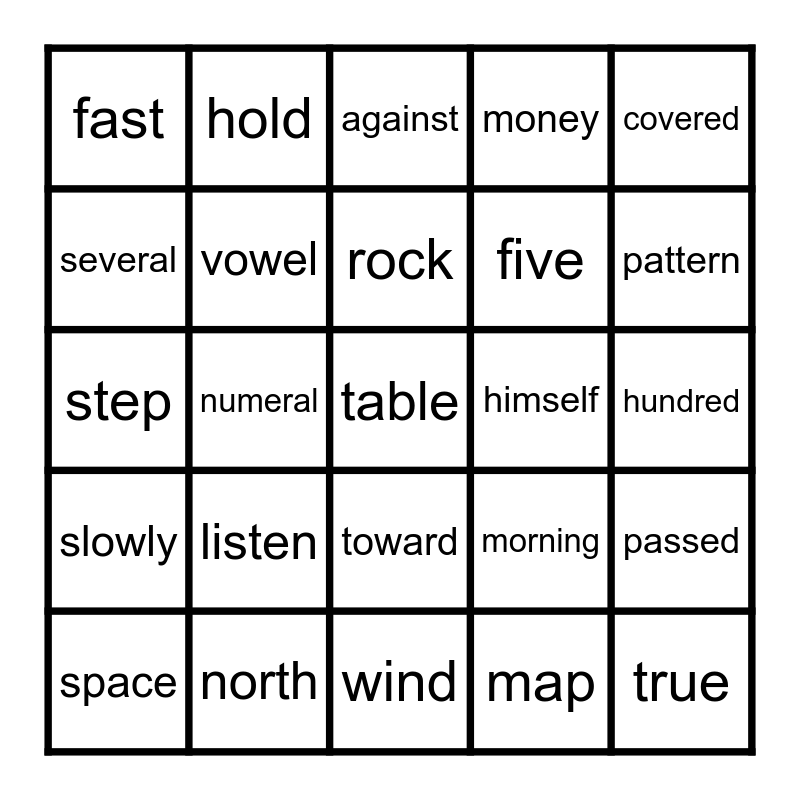 This bingo card has 25 words: listen, wind, rock, space, covered, fast, several, hold, himself, toward, five, step, morning, passed, vowel, true, hundred, against, pattern, numeral, table, north, slowly, money and map.