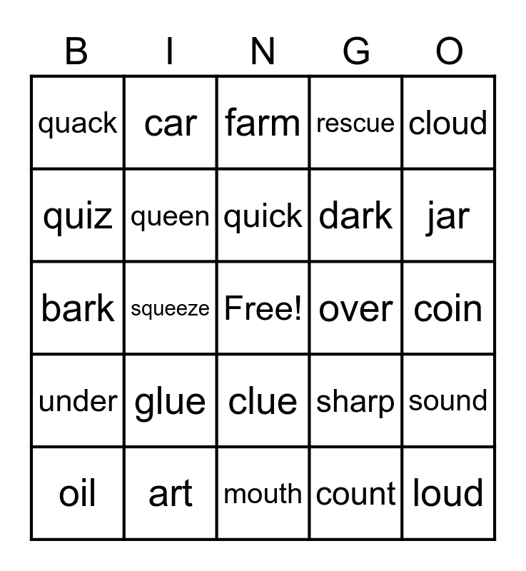 This bingo card has a free space and 34 words: quilt, count, coin, loud, under, queen, cloud, oil, car, river, quick, farm, boil, cue, over, jar, art, bark, glue, sharp, clue, farm, quack, coin, mouth, loud, rescue, mixer, dark, quiz, supper, squeeze, sound and out.