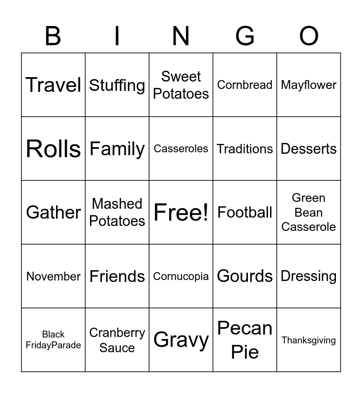 This bingo card has a free space and 29 words: Black FridayParade, Pumpkin Pie, Mashed Potatoes, Turkey, Travel, Sweet Potatoes, Family, Friends, Football, Cranberry Sauce, Green Bean Casserole, Thanksgiving, Gravy, Pecan Pie, Desserts, Harvest, Cornucopia, November, Mayflower, Gather, Gourds, Feast, Traditions, Rolls, Cornbread, Stuffing, Dressing, Casseroles and Leaves.