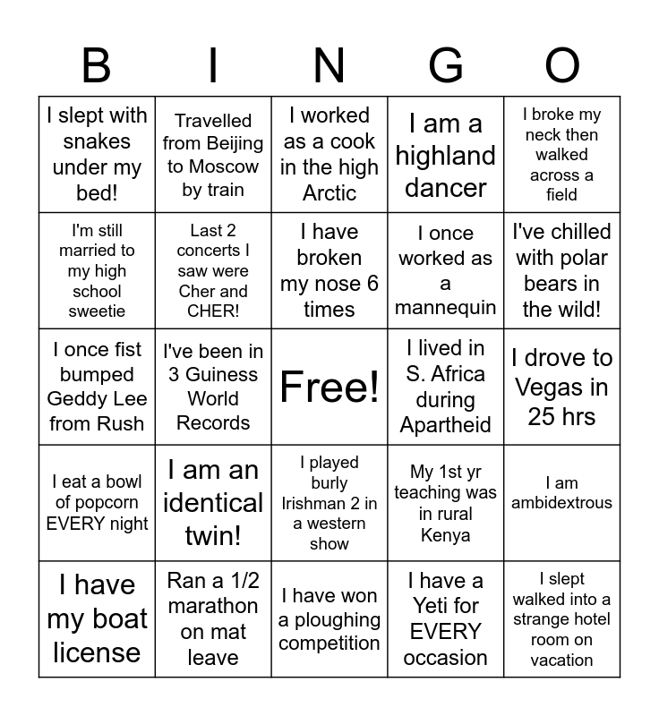 This bingo card has a free space and 24 words: I am an identical twin!, Ran a 1/2 marathon on mat leave, I have broken my nose 6 times, I have my boat license, I broke my neck then walked across a field, I slept with snakes under my bed!, I'm still married to my high school sweetie, Travelled from Beijing to Moscow by train, I lived in S. Africa during Apartheid, I played burly Irishman 2 in a western show, I once worked as a mannequin, I once fist bumped Geddy Lee from Rush, My 1st yr teaching was in rural Kenya, I am ambidextrous, Last 2 concerts I saw were Cher and CHER!, I have a Yeti for EVERY occasion, I drove to Vegas in 25 hrs, I worked as a cook in the high Arctic, I've chilled with polar bears in the wild!, I've been in 3 Guiness World Records, I slept walked into a strange hotel room on vacation, I eat a bowl of popcorn EVERY night, I am a highland dancer and I have won a ploughing competition.