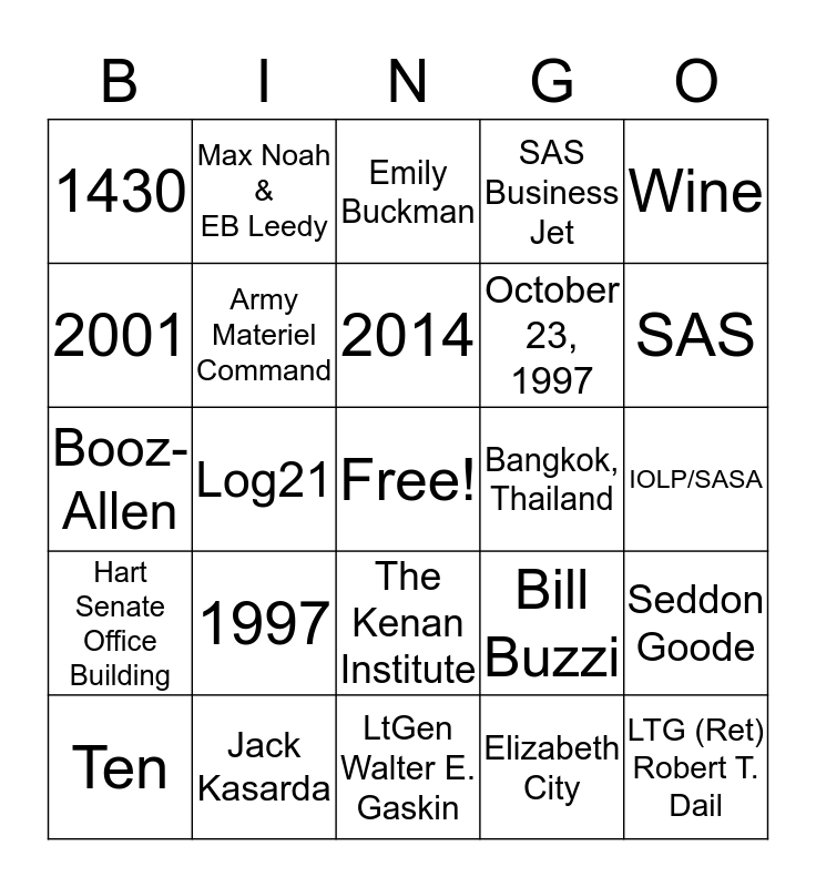 This bingo card has a free space and 24 words: 1997, Jack Kasarda, 2014, Ten, Wine, 1430, 2001, Max Noah & EB Leedy, Bangkok, Thailand, The Kenan Institute, October 23, 1997, Booz-Allen, Bill Buzzi, Seddon Goode, Army Materiel Command, Elizabeth City, IOLP/SASA, Emily Buckman, SAS, Log21, LTG (Ret) Robert T. Dail, Hart Senate Office Building, SAS Business Jet and LtGen Walter E. Gaskin.