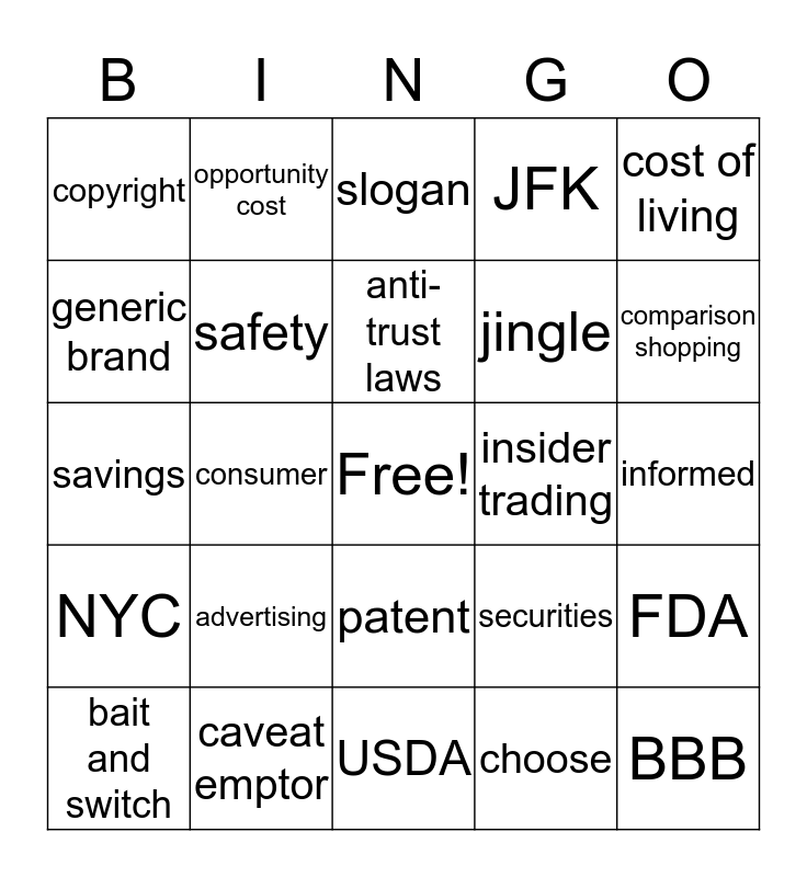 This bingo card has a free space and 24 words: advertising, caveat emptor, anti-trust laws, bait and switch, cost of living, copyright, generic brand, opportunity cost, insider trading, patent, jingle, savings, securities, FDA, safety, choose, informed, slogan, comparison shopping, consumer, BBB, NYC, JFK and USDA.