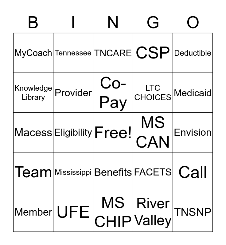 This bingo card has a free space and 24 words: Mississippi, UFE, Co-Pay, Member, Deductible, MyCoach, Knowledge Library, Tennessee, MS CAN, Benefits, LTC CHOICES, Macess, FACETS, Call, Provider, River Valley, Envision, TNCARE, Medicaid, Eligibility, TNSNP, Team, CSP and MS CHIP.