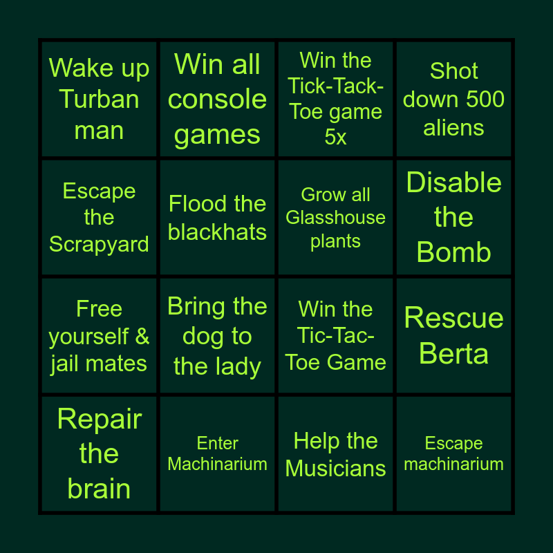 This bingo card has 16 words: Enter Machinarium, Rescue Berta, Win the Tick-Tack-Toe game 5x, Wake up Turban man, Free yourself & jail mates, Win all console games, Win the Tic-Tac-Toe Game, Help the Musicians, Escape the Scrapyard, Flood the blackhats, Repair the brain, Shot down 500 aliens, Bring the dog to the lady, Disable the Bomb, Grow all Glasshouse plants and Escape machinarium.