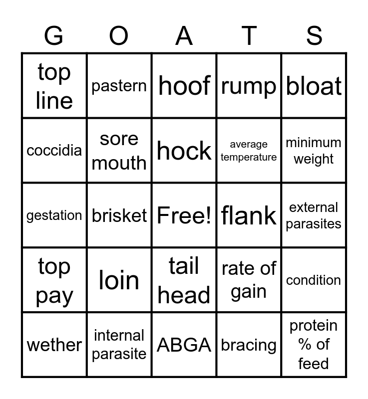 This bingo card has a free space and 24 words: wether, loin, hock, bracing, bloat, top line, pastern, hoof, flank, external parasites, gestation, sore mouth, rate of gain, condition, coccidia, internal parasite, ABGA, rump, minimum weight, top pay, brisket, tail head, average temperature and protein % of feed.