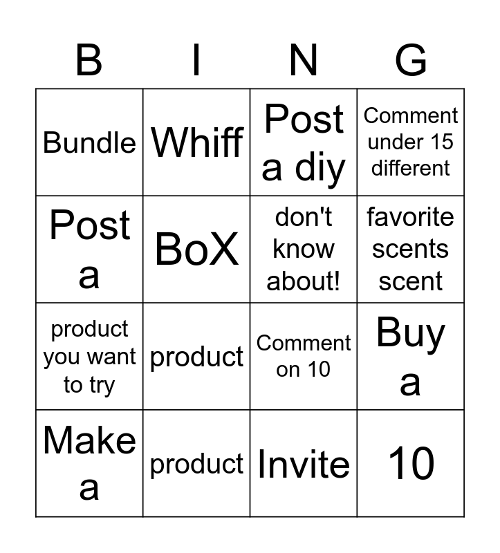 This bingo card has 52 words: Free!, Make a, $25, purchase, Buy a Like 15, Ask about a, Whiff, product you, BoX, posts, don't know about!, Invite, 20+ friends!, Post about Post you, your, favorite, favorite scents scent, product, Ask about a laundry product, Post a, Buy a, picture of a, Bundle, product you want to try, & Save, Like 20 Ask about, a cleaning Free!, posts, product, Post A, Warmer you want!, Comment under 15 different, Posts, Buy a mini, Buy a Like 5, Post a diy, diffuser or bar (car, or recipe, warmer, Or wax!) posts, to the group!, Invite, 10, friends, Comment on 5, different posts, Comment under your favorite product when you see it!, Comment on 10, Invite 5, different friends, posts and Buv a scent circle (or 3!).