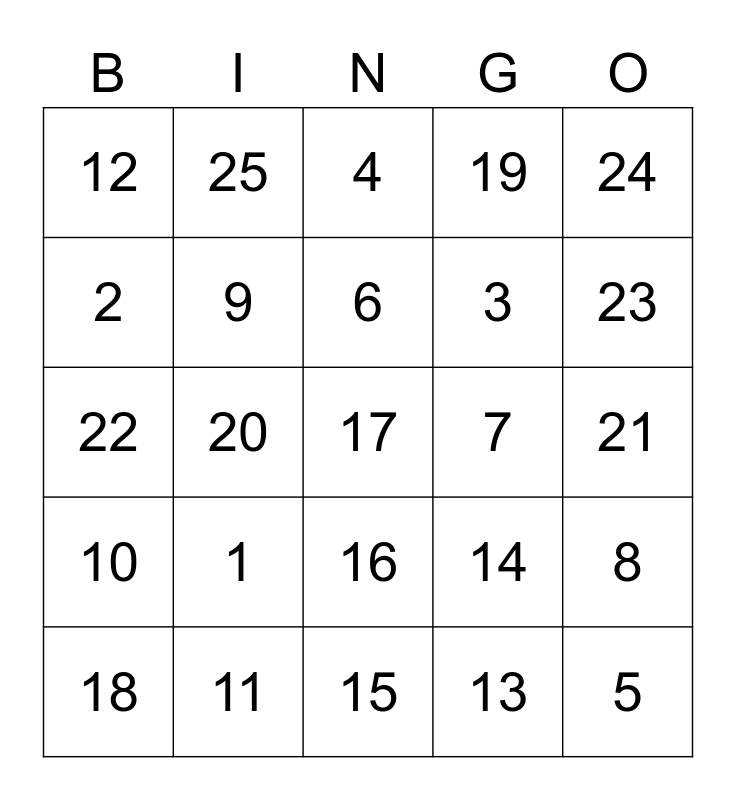 This bingo card has a free space and 24 words: 1, 11, 6, 18, 24, 12, 2, 25, 7, 16, 3, 22, 14, 8, 9, 13, 21, 4, 23, 20, 5, 10, 19 and 15.