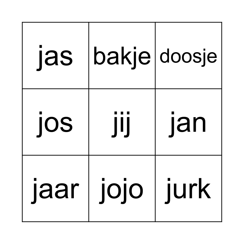 This bingo card has 9 words: jaar, doosje, bakje, jos, jas, jan, jij, jurk and jojo.