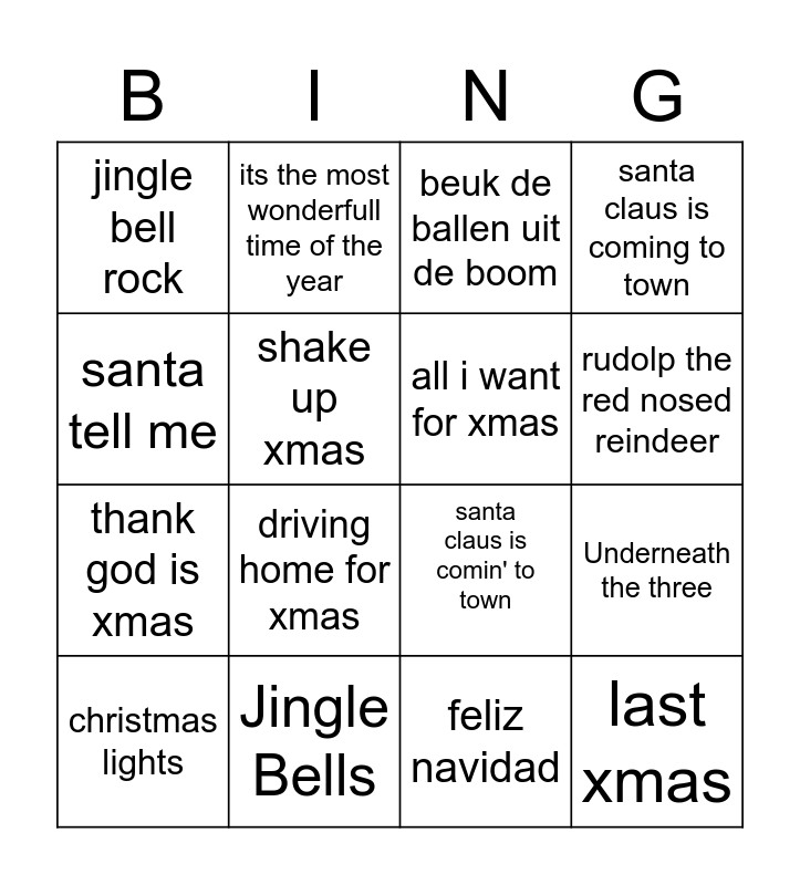 This bingo card has 16 words: Jingle Bells, Underneath the three, beuk de ballen uit de boom, jingle bell rock, thank god is xmas, its the most wonderfull time of the year, santa claus is comin' to town, feliz navidad, santa tell me, shake up xmas, christmas lights, santa claus is coming to town, driving home for xmas, rudolp the red nosed reindeer, all i want for xmas and last xmas.