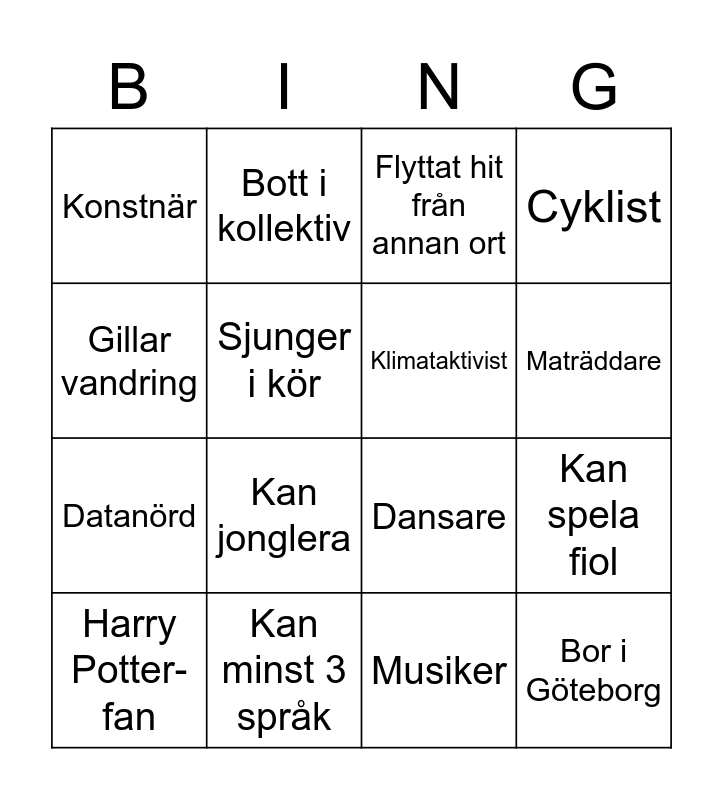 This bingo card has 16 words: Kan minst 3 språk, Kan spela fiol, Flyttat hit från annan ort, Konstnär, Datanörd, Bott i kollektiv, Dansare, Musiker, Gillar vandring, Sjunger i kör, Harry Potter-fan, Cyklist, Kan jonglera, Maträddare, Klimataktivist and Bor i Göteborg.