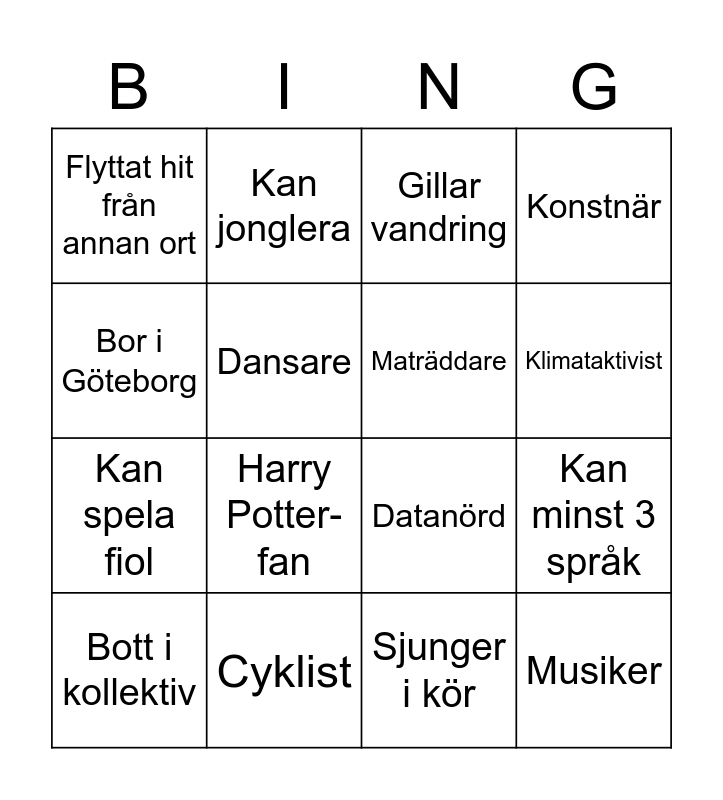 This bingo card has 16 words: Cyklist, Kan minst 3 språk, Gillar vandring, Flyttat hit från annan ort, Kan spela fiol, Kan jonglera, Datanörd, Sjunger i kör, Bor i Göteborg, Dansare, Bott i kollektiv, Konstnär, Harry Potter-fan, Klimataktivist, Maträddare and Musiker.