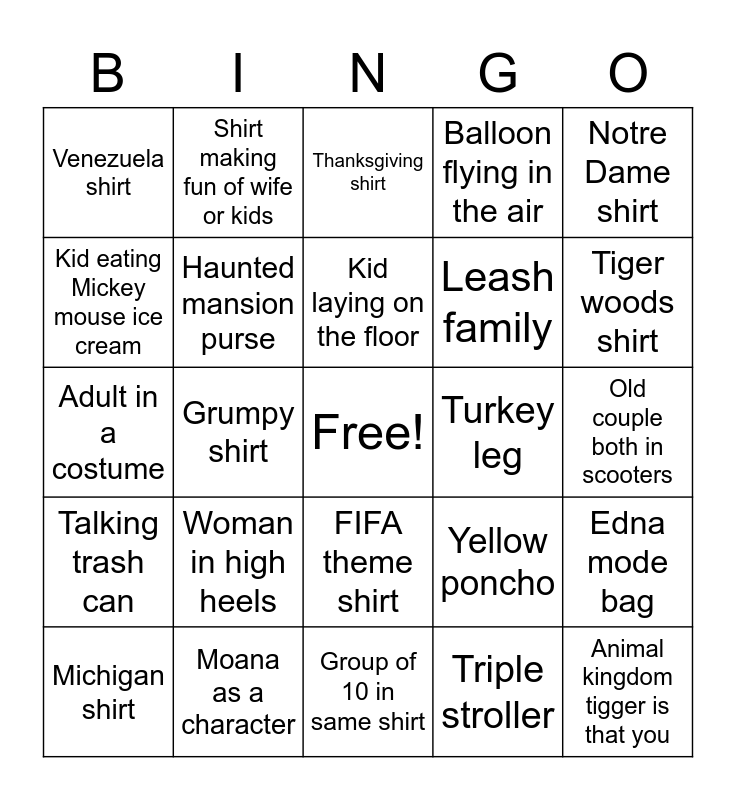 This bingo card has a free space and 25 words: Woman in high heels, Group of 10 in same shirt, Kid laying on the floor, Michigan shirt, Notre Dame shirt, Venezuela shirt, Kid eating Mickey mouse ice cream, Shirt making fun of wife or kids, Turkey leg, FIFA theme shirt, Leash family, Adult in a costume, Yellow poncho, Edna mode bag, Haunted mansion purse, A goofy / max shirt, Old couple both in scooters, Thanksgiving shirt, Tiger woods shirt, Grumpy shirt, Animal kingdom tigger is that you, Moana as a character, Talking trash can, Balloon flying in the air and Triple stroller.