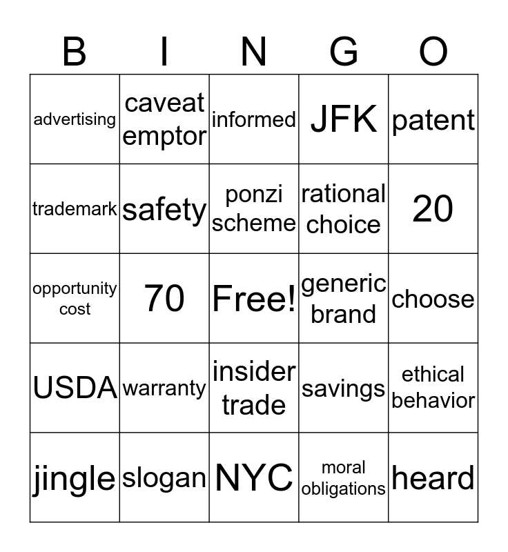 This bingo card has a free space and 24 words: warranty, slogan, ponzi scheme, jingle, patent, advertising, trademark, caveat emptor, generic brand, insider trade, rational choice, opportunity cost, savings, ethical behavior, safety, moral obligations, choose, informed, 20, 70, heard, USDA, JFK and NYC.