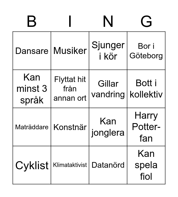 This bingo card has 16 words: Klimataktivist, Harry Potter-fan, Sjunger i kör, Dansare, Maträddare, Musiker, Kan jonglera, Datanörd, Kan minst 3 språk, Flyttat hit från annan ort, Cyklist, Bor i Göteborg, Konstnär, Bott i kollektiv, Gillar vandring and Kan spela fiol.