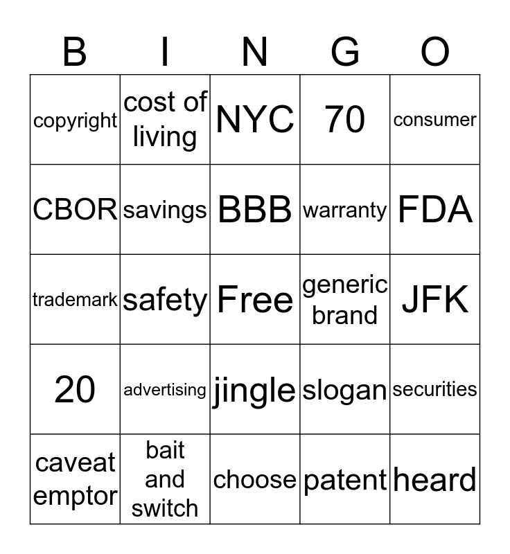 This bingo card has a free space and 24 words: advertising, bait and switch, BBB, caveat emptor, consumer, copyright, CBOR, cost of living, generic brand, jingle, warranty, trademark, slogan, securities, savings, patent, JFK, NYC, FDA, safety, heard, 20, 70 and choose.