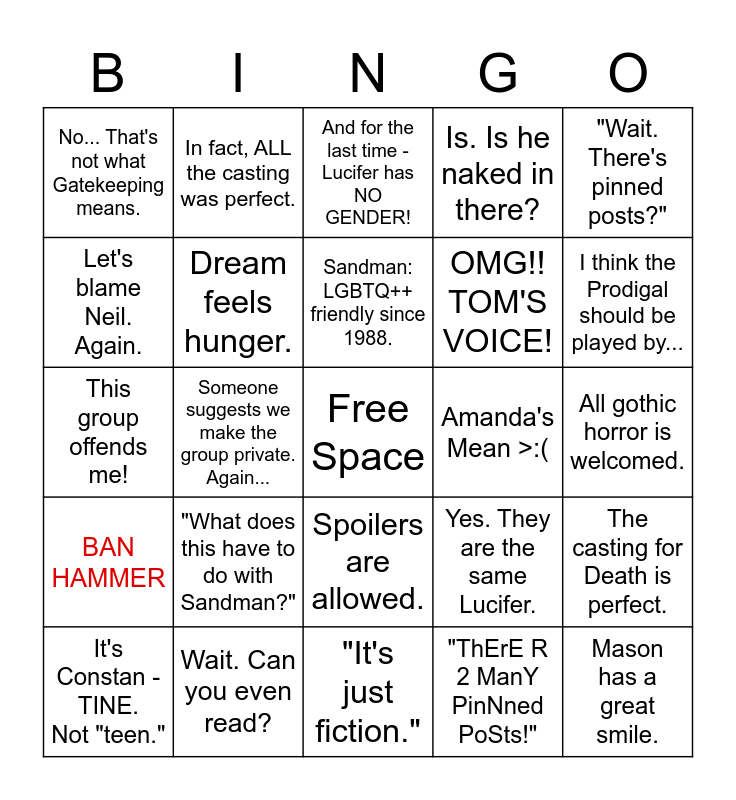 This bingo card has a free space and 24 words: "What does this have to do with Sandman?", Wait. Can you even read?, Sandman: LGBTQ++ friendly since 1988., It's Constan - TINE. Not "teen.", "Wait. There's pinned posts?", No... That's not what Gatekeeping means., Let's blame Neil. Again., In fact, ALL the casting was perfect., Amanda's Mean >:(, Spoilers are allowed., OMG!! TOM'S VOICE!, This group offends me!, Yes. They are the same Lucifer., The casting for Death is perfect., Dream feels hunger., "ThErE R 2 ManY PinNned PoSts!", All gothic horror is welcomed., And for the last time - Lucifer has NO GENDER!, I think the Prodigal should be played by..., Someone suggests we make the group private. Again..., Mason has a great smile., BAN HAMMER, Is. Is he naked in there? and "It's just fiction.".