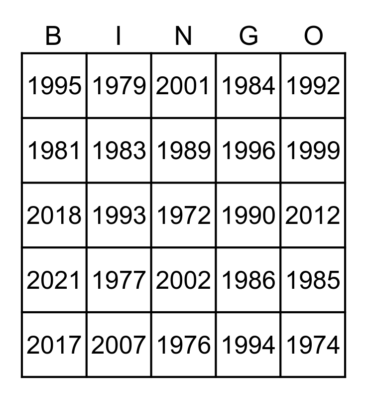 This bingo card has a free space and 50 words: 1973, 1974, 1975, 1976, 1977, 1978, 1979, 1980, 1981, 1982, 1983, 1984, 1985, 1986, 1987, 1988, 1989, 1990, 1991, 1992, 1993, 1994, 1995, 1996, 1997, 1998, 1999, 2000, 2001, 2002, 2003, 2004, 2005, 2006, 2007, 2008, 2009, 2010, 2011, 2012, 2013, 2014, 2015, 2016, 2017, 2018, 2019, 2020, 2021 and 2022.