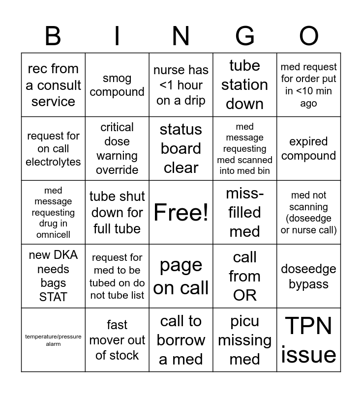 This bingo card has a free space and 45 words: compatibility question, TPN issue, stat alteplase, temperature/pressure alarm, code response needed, picu missing med, nurse has <1 hour on a drip, move meds between omnicell, med request for order put in <10 min ago, fast mover out of stock, tube station down, miss-filled med, page on call, request for med to be tubed on do not tube list, retail (break-in, counseling, nurse calling wrong #), call to borrow a med, forgot ab med in hazard room, med message requesting drug in omnicell, need new tackle box, expired compound, smog compound, premix station with >5 to prep, page or call NNP, rec from a consult service, med sent secure returns in tube, med not scanning (doseedge or nurse call), trauma B/stab code/OB c-section, expired med (not compound), call from OR, new DKA needs bags STAT, pharm-is ticket, doseedge bypass, brand new TPN, new LOS/EOS orders, call from outside pharm to borrow med, tube shut down for full tube, request for vfc vaccine, recon antibiotic, ID home med, status board clear, request for on call electrolytes, med message requesting med scanned into med bin, phone call from MD needing dose recommendation, critical dose warning override and need to make dilution narc.