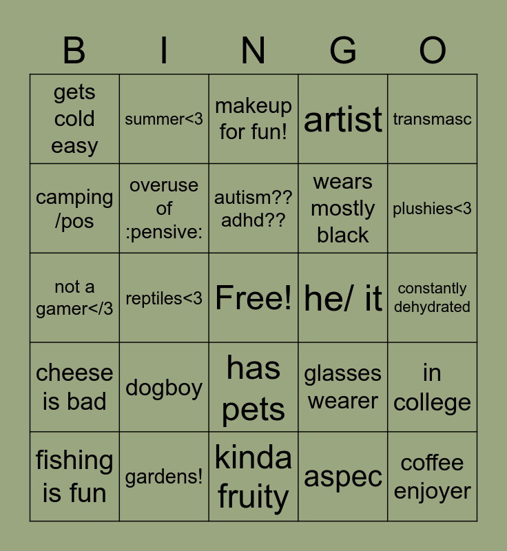 This bingo card has a free space and 24 words: dogboy, gardens!, autism?? adhd??, fishing is fun, transmasc, gets cold easy, camping /pos, summer<3, he/ it, has pets, wears mostly black, not a gamer</3, glasses wearer, in college, overuse of :pensive:, aspec, constantly dehydrated, makeup for fun!, plushies<3, reptiles<3, coffee enjoyer, cheese is bad, artist and kinda fruity.