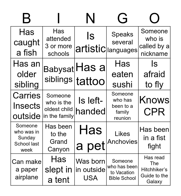 This bingo card has 25 words: Has been to the Grand Canyon, Was born in outside USA, Has a tattoo, Can make a paper airplane, Someone who is called by a nickname, Has caught a fish, Has an older sibling, Has attended 3 or more schools, Someone who has been to a family reunion, Has a pet, Has eaten sushi, Carries Insects outside, Likes Anchovies, Has been in a fist fight, Babysat siblings, Has read The Hitchhiker’s Guide to the Galaxy, Knows CPR, Is artistic, Is afraid to fly, Someone who is the oldest child in the family, Is left-handed, Has slept in a tent, Someone who was in Sunday School last week, Speaks several languages and Someone who has been to Vacation Bible School.