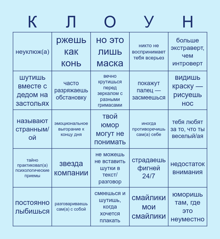 This bingo card has a free space and 24 words: звезда компании, разговариваешь сам(а) с собой, вечно крутишься перед зеркалом с разными гримасами, постоянно лыбишься, больше экстраверт, чем интроверт, неуклюж(а), шутишь вместе с дедом на застольях, ржешь как конь, иногда противоречишь сам(а) себе, не можешь не вставить шутки в текст/разговор, покажут палец — засмеешься, называют странным/ой, страдаешь фигней 24/7, недостаток внимания, часто разряжаешь обстановку, смайлики мои смайлики, тебя любят за то, что ты веселый/ая, но это лишь маска, видишь краску — рисуешь нос, эмоциональное выгорание к концу дня, юморишь там, где это неуместно, тайно практиковал(а) психологические приемы, никто не воспринимает тебя всерьез and смеешься и шутишь, когда хочется плакать.