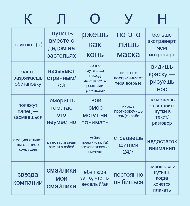 This bingo card has a free space and 24 words: звезда компании, разговариваешь сам(а) с собой, вечно крутишься перед зеркалом с разными гримасами, постоянно лыбишься, больше экстраверт, чем интроверт, неуклюж(а), шутишь вместе с дедом на застольях, ржешь как конь, иногда противоречишь сам(а) себе, не можешь не вставить шутки в текст/разговор, покажут палец — засмеешься, называют странным/ой, страдаешь фигней 24/7, недостаток внимания, часто разряжаешь обстановку, смайлики мои смайлики, тебя любят за то, что ты веселый/ая, но это лишь маска, видишь краску — рисуешь нос, эмоциональное выгорание к концу дня, юморишь там, где это неуместно, тайно практиковал(а) психологические приемы, никто не воспринимает тебя всерьез and смеешься и шутишь, когда хочется плакать.