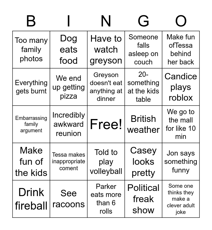 This bingo card has a free space and 24 words: Tessa makes inappropriate coment, See racoons, Greyson doesn't eat anything at dinner, Drink fireball, Make fun ofTessa behind her back, Too many family photos, Everything gets burnt, Dog eats food, British weather, Told to play volleyball, 20-something at the kids table, Embarrassing family argument, Casey looks pretty, Jon says something funny, We end up getting pizza, Political freak show, We go to the mall for like 10 min, Have to watch greyson, Candice plays roblox, Incredibly awkward reunion, Some one thinks they make a clever adult joke, Make fun of the kids, Someone falls asleep on couch and Parker eats more than 6 rolls.