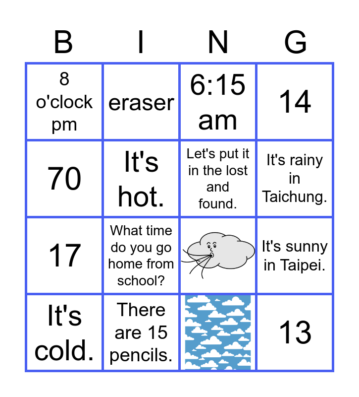 This bingo card has 2 images and 14 words: There are 15 pencils., It's sunny in Taipei., 6:15 am, 8 o'clock pm, 17, eraser, 70, It's hot., It's cold., 14, What time do you go home from school?, It's rainy in Taichung., Let's put it in the lost and found. and 13.