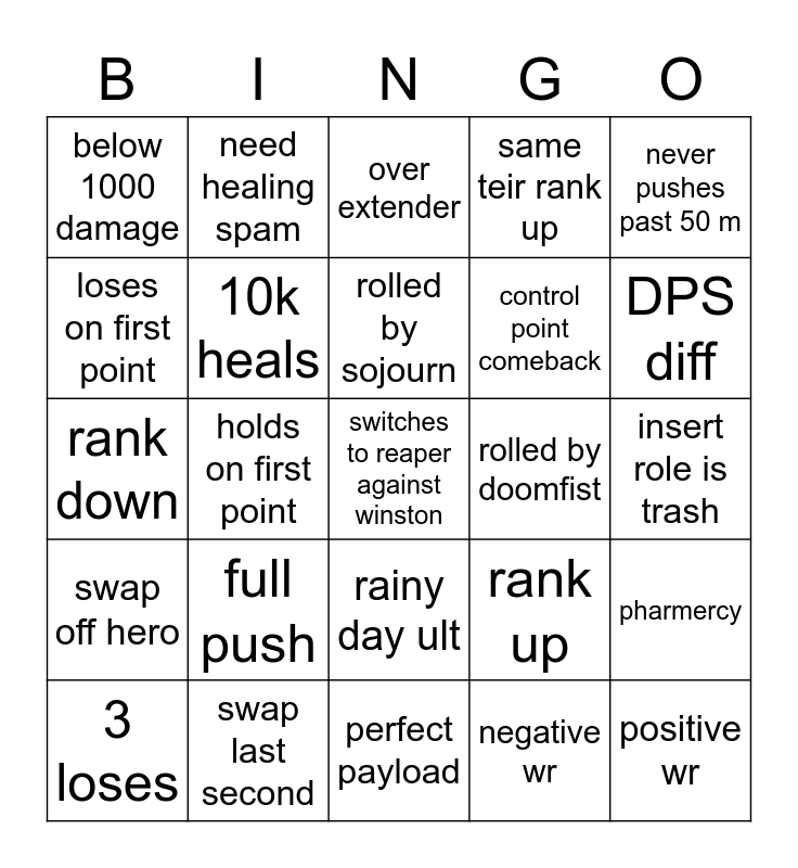 This bingo card has a free space and 67 words: loses with mercy, solo queue sigh, zarya, pharmercy, leaver/DC, need more damage, need healing spam, racial slur, rolled by sojourn, moira player, rainy day ult, reddit lucio, insert role is trash, never pushes past 50 m, old Tyrone, loses on first point, holds on first point, below 1000 damage, never wins on junkertown, control point comeback, full push, swap off hero, same teir rank up, negative wr, hero crisis, Alex grav, supp diff, MTD, DPS diff, perfect control point, positive wr, huge shatter, PMA solo queuer, huge ult, 3 wins, 3 loses, sym OTP, rank up, rank down, Cassidy deadnaming, 10k damage, 10k heals, rolled by doomfist, ball stall, Capture point OT, pity win, bad Lamp, swap last second, postgame voice chat, even wr, over extender, give up, funny joke, depressed solo queuer, dead chat, perfect payload, e-girl, Fat head, ggez filter spam, warm-up game, DOH choke, Ink to lord solo q, Z9, pussy solo q, John Fist, John Sojourn and Kaztiste.
