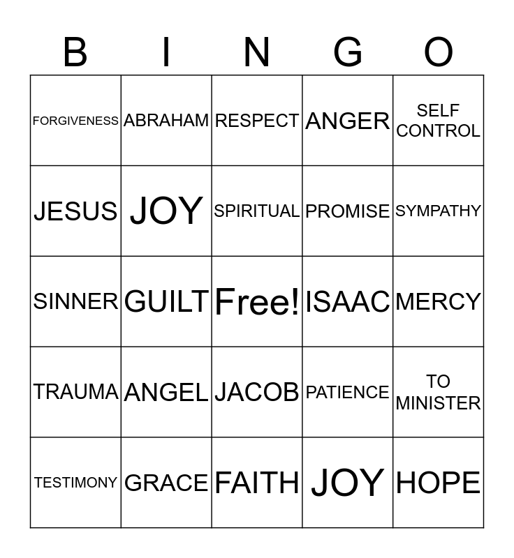 This bingo card has a free space and 25 words: ANGEL, FAITH, SPIRITUAL, TESTIMONY, SELF CONTROL, FORGIVENESS, JESUS, ABRAHAM, ISAAC, JACOB, PROMISE, SINNER, PATIENCE, TO MINISTER, JOY, LOVE, MERCY, RESPECT, SYMPATHY, GUILT, HOPE, GRACE, TRAUMA, ANGER and JOY.