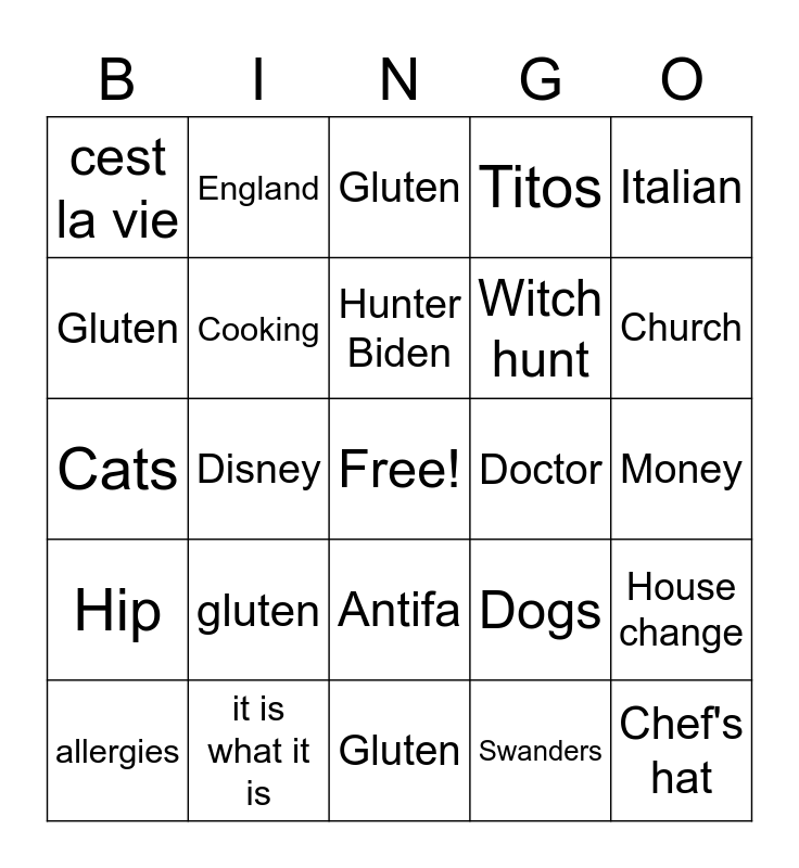 This bingo card has a free space and 24 words: gluten, it is what it is, Hunter Biden, allergies, Italian, cest la vie, Gluten, England, Doctor, Antifa, Witch hunt, Cats, Dogs, House change, Cooking, Swanders, Money, Gluten, Church, Disney, Chef's hat, Hip, Titos and Gluten.