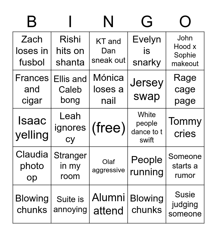 This bingo card has a free space and 24 words: Stranger in my room, Suite is annoying, Mónica loses a nail, Blowing chunks, John Hood x Sophie makeout, Zach loses in fusbol, Frances and cigar, Rishi hits on shanta, White people dance to t swift, Olaf aggressive, Jersey swap, Isaac yelling, People running, Someone starts a rumor, Ellis and Caleb bong, Blowing chunks, Tommy cries, KT and Dan sneak out, Rage cage page, Leah ignores cy, Susie judging someone, Claudia photo op, Evelyn is snarky and Alumni attend.